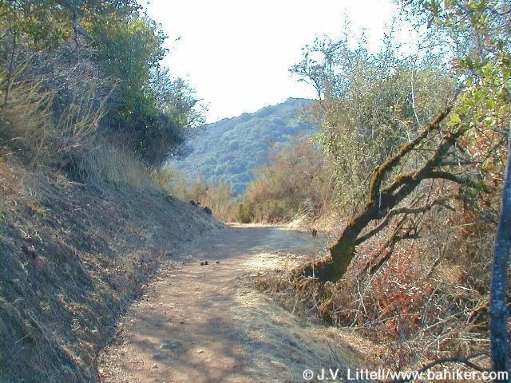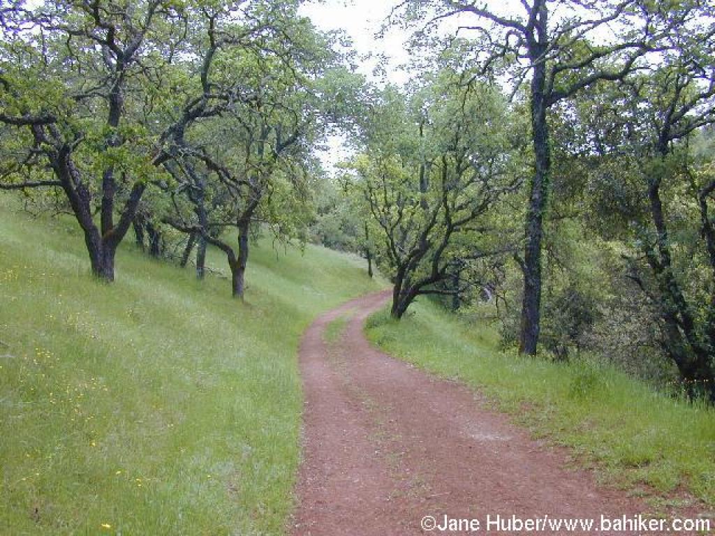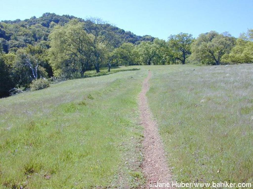 A grassy meadow slopes downhill on the left, and beyond the forested slopes of Black Mountain loom. You may be able to make out a string of high-tension power lines -- this is where you're headed on the way to the top. The medium-width trail, closed to cyclists, winds through oak woodlands at a level pace, then emerges in