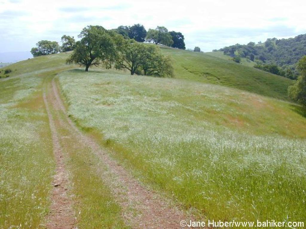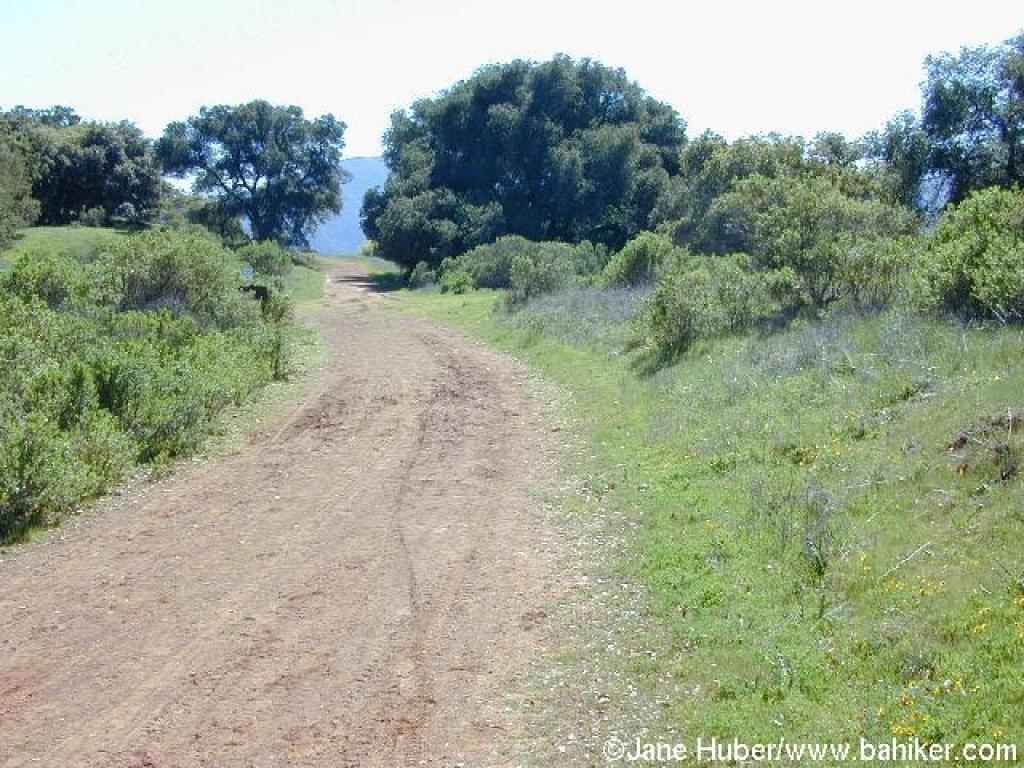 English Camp Trail, open to hikers and equestrians only, descends. A grassy hillside on the left side of the trail is a sure bet for spring flowers including blue and white lupine, shooting stars, redmaids, California buttercups, and fiddlenecks. A few coast live oaks fail to provide adequate shade on a hot afternoon. At 6.23 miles, a road sets out on the right side of the trail -- this is the "coming soon" Deep