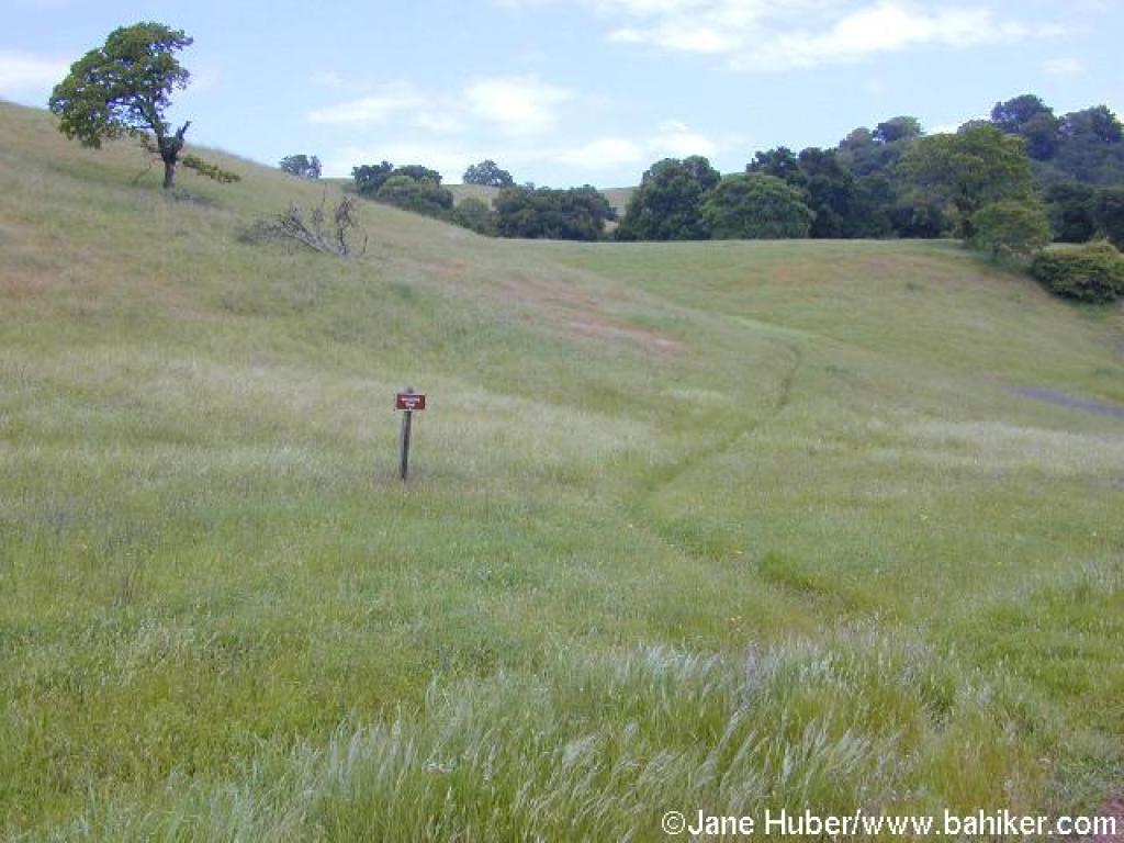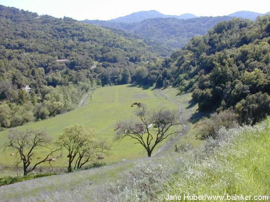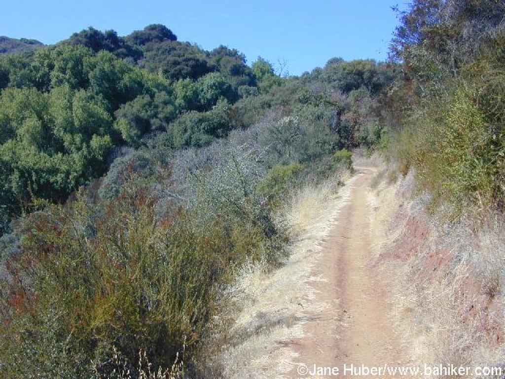 add brilliant color to the verdant grass in early spring. Deer may be glimpsed in the distance. A small creek runs through the valley floor downslope to the right. Vallecito Trail crosses a damp spot and then begins to climb. Poison oak islands off the left side of the trail add a burst of color to the hillside in the autumn when their leaves turn red. A few oaks dot the slopes. As the path nears the crest, be sure to look back for a lovely view of the valley. The unsigned junction with Peña Trail comes into view, as Vallecito Trail ends at 4.27 miles. Turn right onto Peña Trail.