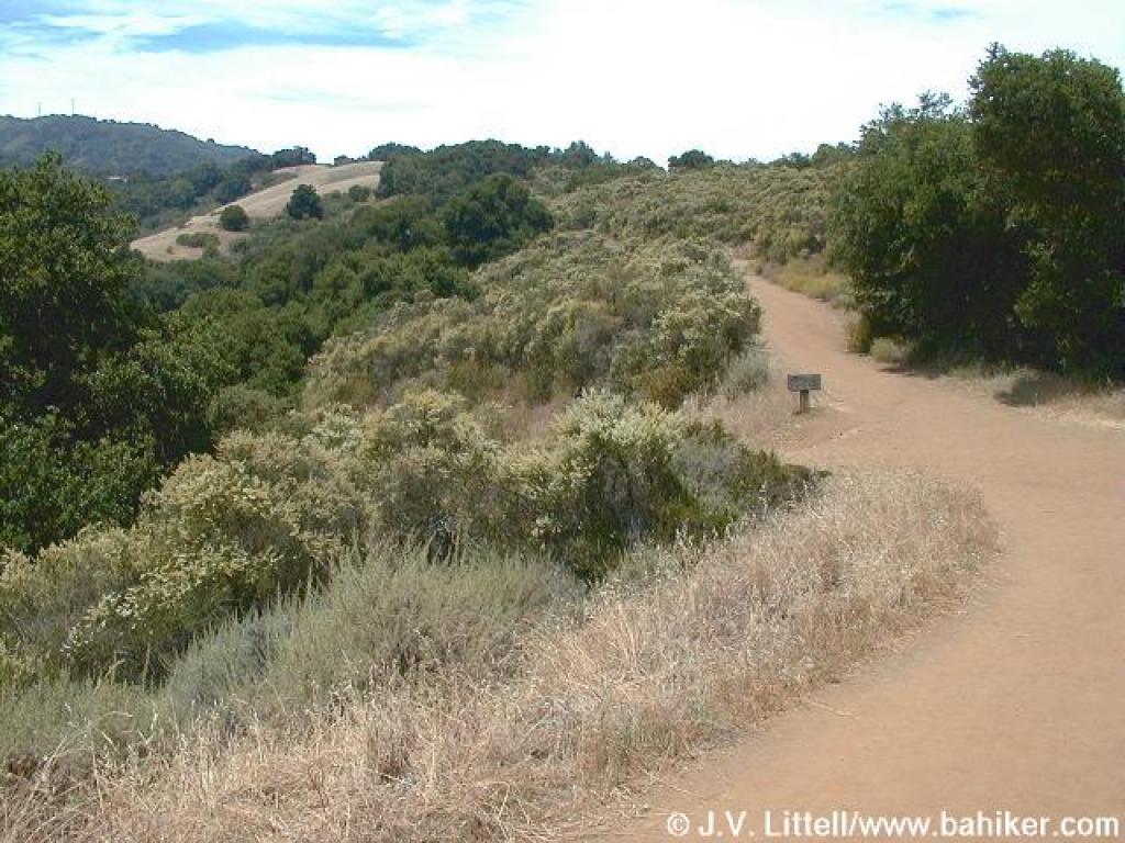 among the coyote brush, Skyline Trail descends gently to a signed junction at 1.22 miles. Sanborn Trail heads downhill to the right. Turn left to remain on Skyline Trail.