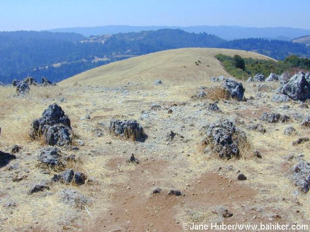 After a brief gentle climb through grassland, you'll reach the top of Black Mountain, with an elevation just over 2800 feet. Look to the right for an unsigned path into some rock formations. Turn right, and at 4.58 you'll reach the turn-around point for the hike. You may spend some minutes looking for the USGS elevation marker, plastered into a rock. The views are outstanding: to the west Skyline Ridge and Butano Ridge are visible, south the highest elevations of the Santa Cruz Mountains stand out, and a glimpse north reveals the descending hills of Monte Bello. After the climb, it's pleasant to stretch out, loosen your boots, eat lunch, and refuel with something cold. When you're ready, retrace your steps back to the trailhead.