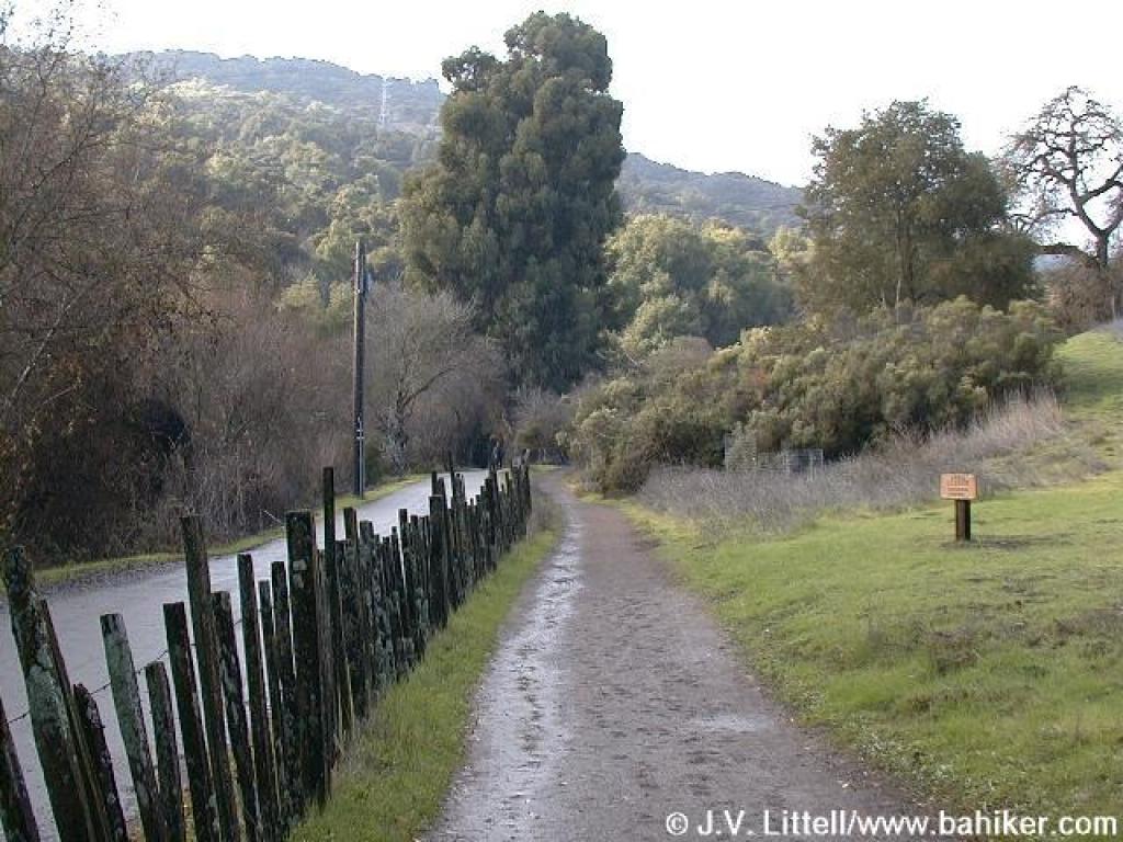 passing through a grassy area with some elegant coast live oaks. A fence guards a steep dropoff as the trail drops to a bridge. There's nowhere to go but up, and Stevens Creek Tony Look Trail climbs a bit before reaching a clear spot with yerba santa-framed views of the southern tip of the reservoir. In autumn, look for lovely golden leaves on sycamores at the shoreline. Stevens Creek Tony Look Trail descends again, and another fence prevents shortcuts as a shallow switchback channels the trail downhill. Through the trees you might see ducks and herons in the quiet pools of the reservoir. The narrow trail edges beneath a strange slab of rock where small seasonal waterfalls feed the reservoir on rainy winter days. After one last bridge, the trail climbs through grassy woodland and reaches Laurel Flat, the end of the volunteer built section of trail. The trail widens and passes what seems to be the park dump on the left. At 2.76 miles a gate blocks the fire road's exit to Stevens Canyon Road. Take the trail to the left.