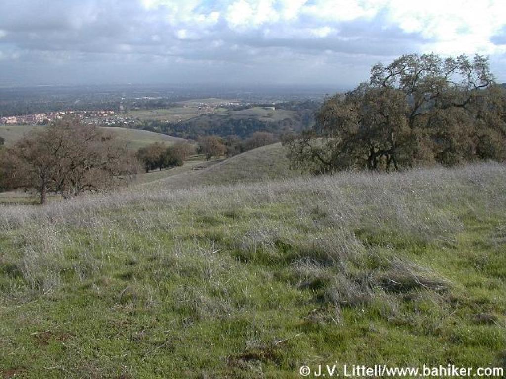 After your flat warmup, you'll finally begin to climb on High Meadow Trail. Along the sides of the trail, look for monkeyflower, sagebrush, silktassel, coyote brush, pitcher sage, buckeye, coast live oak, and blue oak. Switchbacks keep the grade easy on this trail open to equestrians and hikers only. Views to the south are revealed almost immediately. High Meadow Trail sweeps uphill through some oaks and grassland, with a bench under some coast live oaks creating a nice rest spot. In late spring you might see lots of white mariposa lily, as well as Ithuriel's spear, mule ear sunflower, and brodaiea. Wood fences keep the trail intact as it ascends; ignore any shortcuts. Suddenly you'll climb along the flanks of a grassy knoll, a dramatic counterpart to the aptly named Black Mountain, looming to the west. Cercocarpus (mountain mahogany), and toyon mingle with the trailside oaks. Too soon, the trail crests and reaches a signed junction at 1.89 miles. Turn left and walk to the crest on an unmarked short path. The view from the belvedere showcases the rolling foothills of Rancho, and the lovely oak grassland you've just climbed through. This is a sure spot for spring wildflower hunting, or a lunch break on a cool day.Retrace your steps