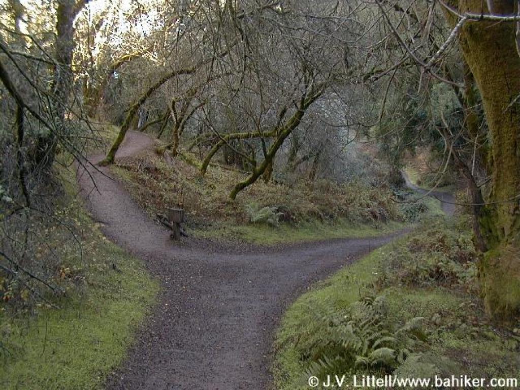 gently descends. At 3.85 miles, Upper Wildcat Creek Trail meets Wildcat Loop Trail at a signed junction. Buckeyes, maples, oaks, and California bay mingle gracefully, with ferns, creambush, and berry bushes tangled in the understory. Stay to the right.