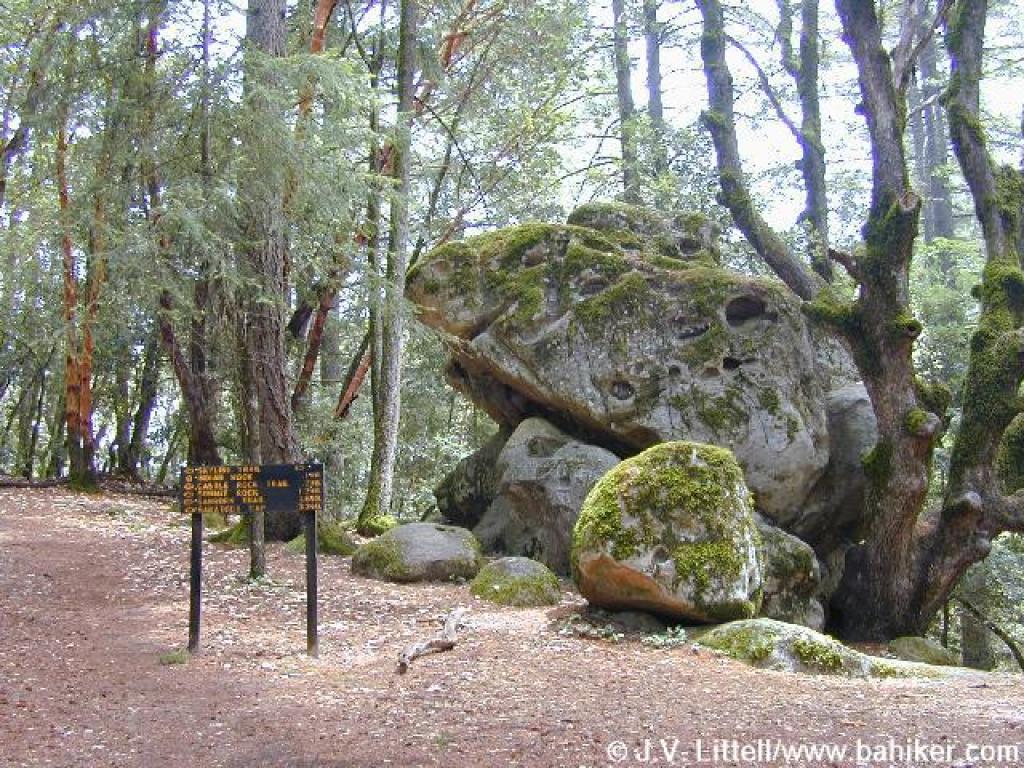 giants live a somewhat sheltered existence, shielded from winter winds by the hillside to the left. The trail bends right near an old metal "no bikes" sign. Adopting a slightly wider girth, Skyline Trail winds through a magnificent and quiet forest which is especially lovely when fog blows across the ridge from the west and billows downhill into the woods. Although you are never far from Skyline Boulevard, traffic noise is only occasional (especially on weekdays). Skyline Trail narrows again, and more rock formations appear, looming out of the woods on both sides of the trail. At 3.02 miles, the trail reaches a trail sign, huge boulder, and roadside parking (I call this the Indian Rock Trailhead). Walk a few feet more uphill to the right, to Indian Rock(s), where black oaks, madrones, and coast live oaks provide shade and a perfect spot for a lunch break among the rock formations. When ready, retrace your steps back to the trailhead.
