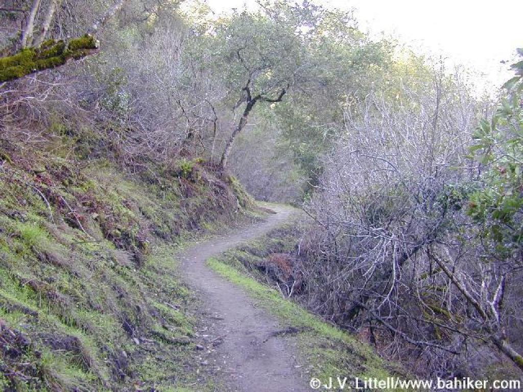 your hike almost 2 miles. Turn left onto Upper Wildcat Canyon Trail. A slight descent begins on this hiking and equestrian trail. Look for toyon, silktassel, coast live oak, chamise, sagebrush, pitcher sage, cercocarpus, California coffeeberry, poison oak, and madrone. If you can tear yourself away from the views and the plants, look down at the trail. I've seen bobcat and coyote tracks, and one time spotted a sizable furry scat that was issued forth from a large mammal, perhaps even a mountain lion (although since I saw no cougar tracks, it was probably a large coyote or bobcat). As you lose elevation, the vegetation begins a subtle shift. Buckeyes, madrones, and California bays herald your arrival to the cool, damp canyon floor. This is a quiet place, where the melodic gurgle of the creek may only be matched by the sounds of small airplanes occasionally passing by overhead, and the pounding of joggers' footfalls. California bay and maple tree trunks are adorned with velvet green moss coats, and it seems as it the sun never reaches the canyon floor. Bridges cross the creek several times, as the trail