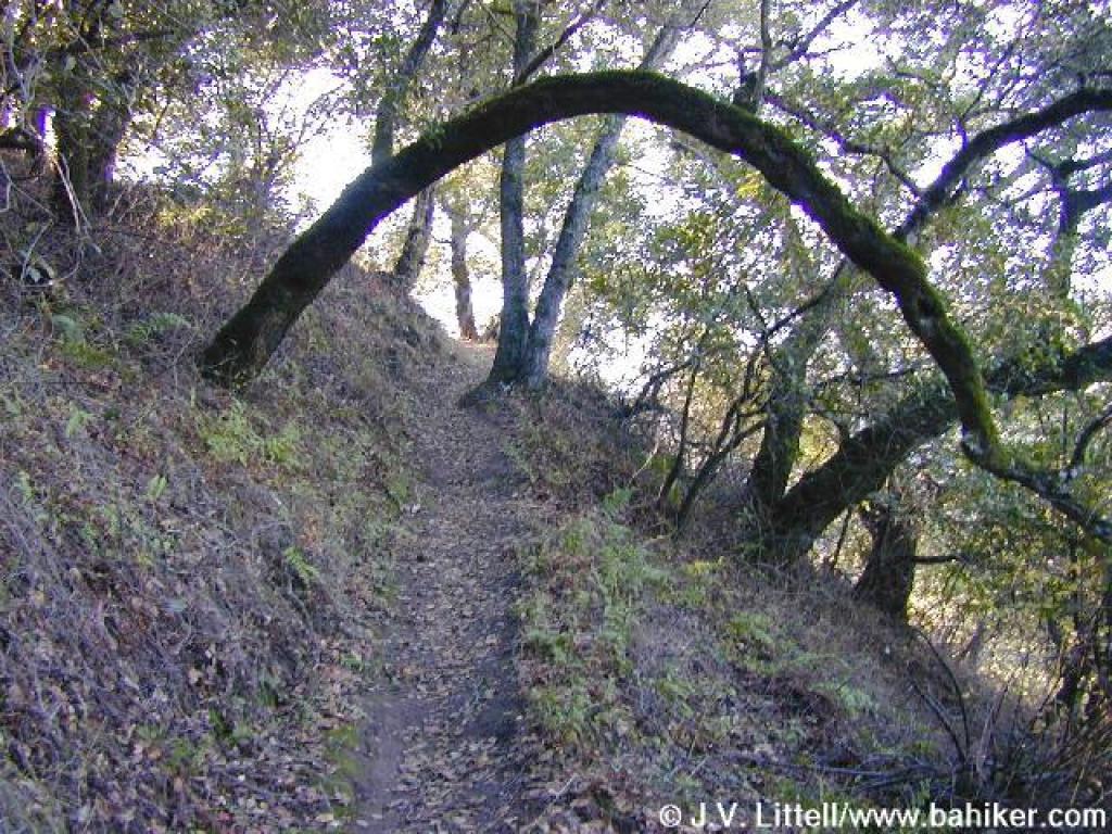 here (the Fremont Older map suggests the transition at the Madrone Group Area; it doesn't really matter because it's the only trail at this point). The trail is very narrow in sections, and although switchbacks cushion the blow of much of the climb, the ascent will have your heart pumping. Luckily, the trail is thickly forested with coast live oak and California bay, so it's cool and shady. Look for creambush and gooseberry in the understory. At a grassy flat spot on the right side of the trail, a break in the trees reveals a spectacular view to the southwest (this is a nice lunch spot). In autumn, on the high, sloping vineyards across the valley, grape leaves, lit with color, stand out from the surrounding chaparral and woods. At 3.63 miles, Lookout Trail crests and crosses through a gate into Fremont Older and grassland.