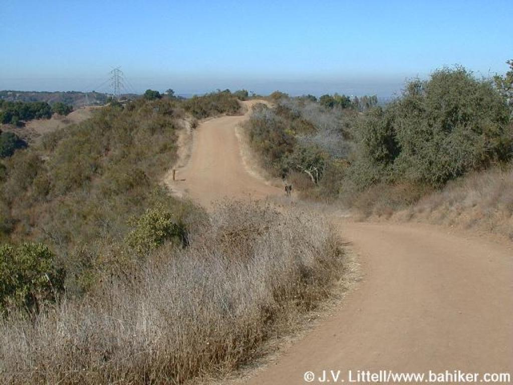 gradual. I always expect to see animals along the trail, since coyote, bobcat, and fox scat is so common, but I've never seen anything more exotic than deer. You might notice a few manzanita shrubs and some madrone. Following one last, nearly level foray through coast live oak woods, the trail steps out under a high-tension power line, at 3.24 miles. Although broadened to fire road width, the trail is still closed to cyclists. From this point it's about 1000 feet (the bulk of it achieved in a little over 1 mile) to the summit. At first Black Mountain Trail runs along the power lines, through a combination of buckeye, coast live oak, poison oak, buckbrush, coyote brush, yerba santa, pitcher sage, and coffeeberry, but the trail soon curves left and heads uphill, while the power lines continue across the upper reaches of Hidden Villa. At 3.44 miles generic trail signs point you straight ahead, while a barely-there path breaks off to the right. Continue straight on Black Mountain